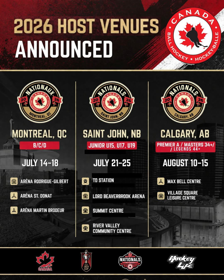New Brunswick Ball Hockey Association, Hockey Balle Québec / Ball Hockey Quebec, and Ball Hockey Alberta for their dedication and effort in preparing outstanding bids for the 2026 Nationals